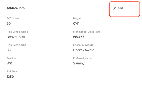 Customizable Athlete Info Section: In the athlete info section, you can customize what type of data you want to track and display, whether academic, athletic, or basic information. This ensures you have the most critical information available at a glance and can easily edit or update it as needed.