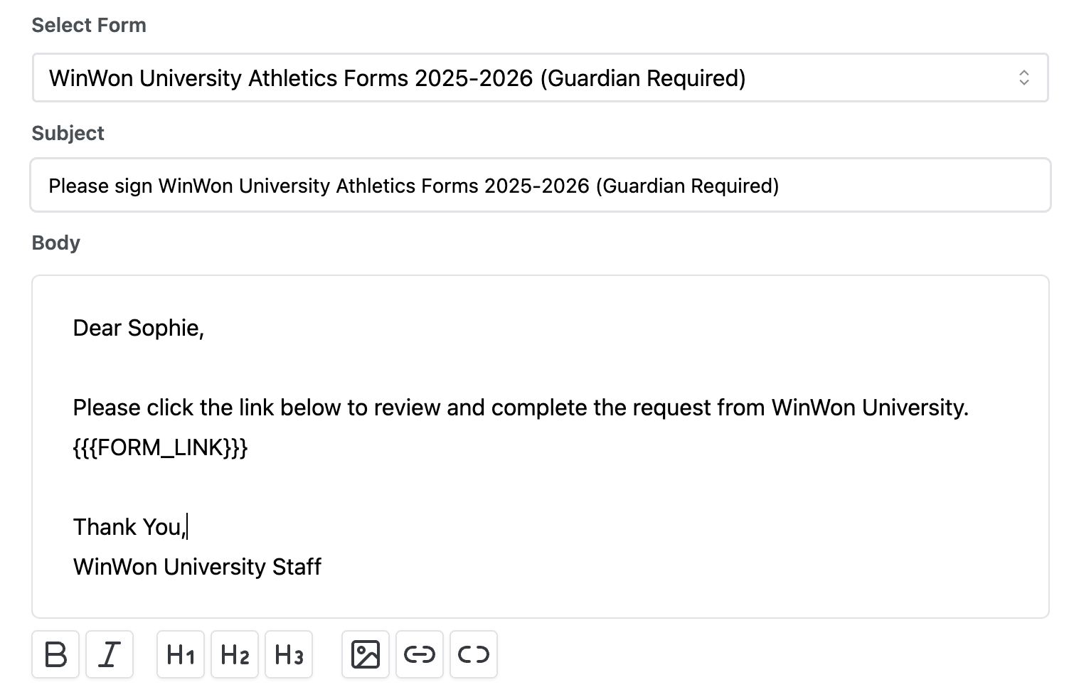 As with bulk send, the system personalizes the email with the athlete’s name, school name, and unique form link.