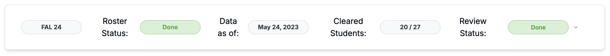 Header Banner: Displays the academic term (e.g. SPR 25), roster status, cleared students count, and academic eligibility review status.