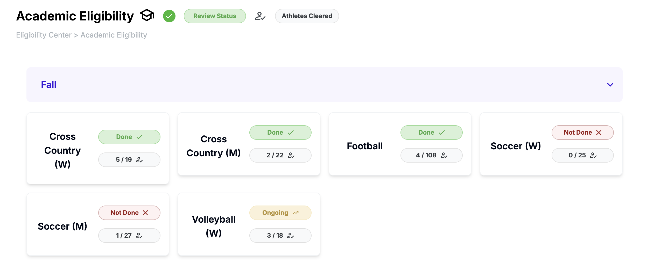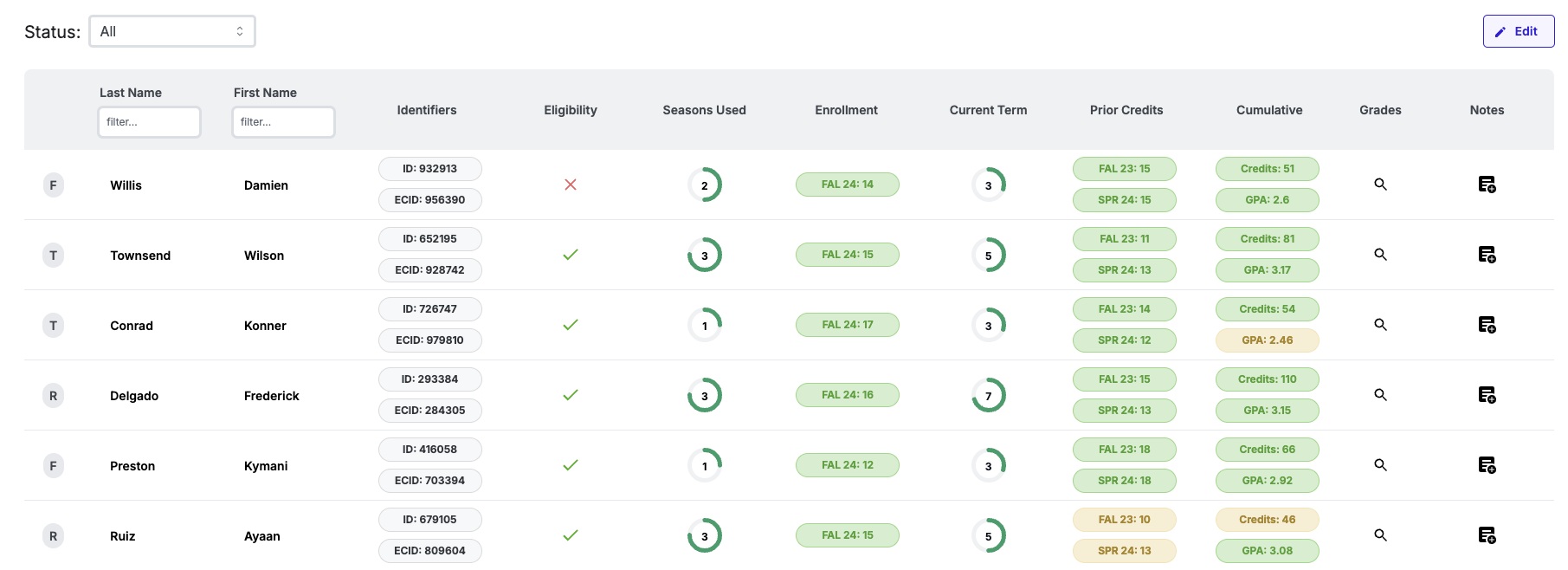 | Eligibility | Marks athletes as eligible (green check) or ineligible (red X). | Yes |