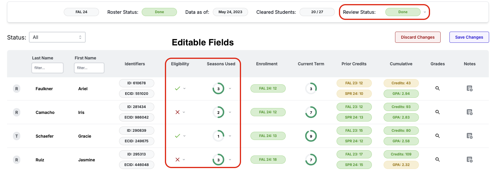 - Roster Status: Indicates if a coach has confirmed the team roster. This ensures eligibility reviews are only performed on confirmed rosters. Learn more about Confirming Rosters.