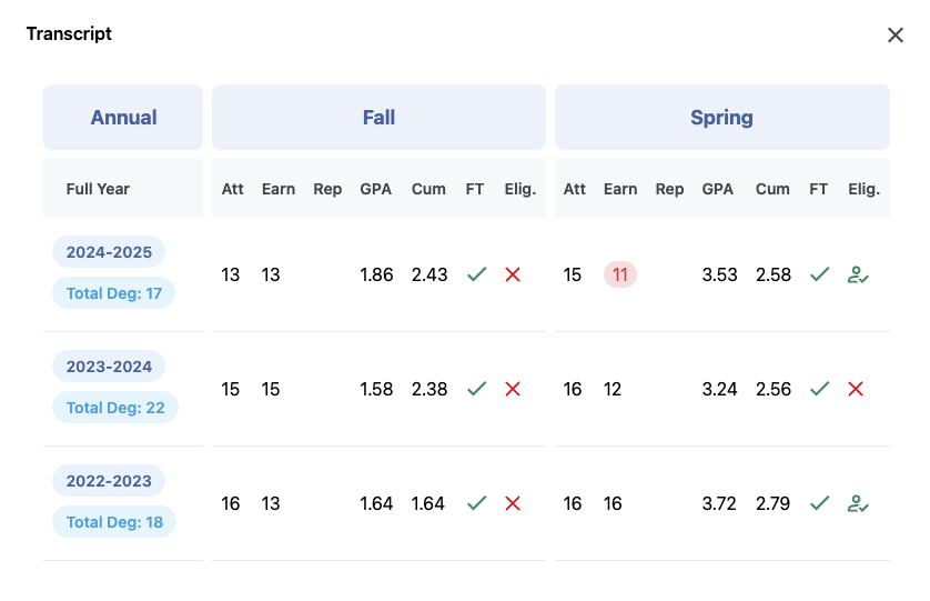 Access a student’s full academic history by clicking the magnifying glass 🔍 in the Grades column. The transcript includes: