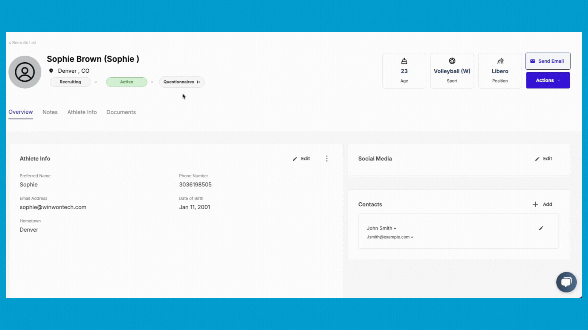 Add Key Contacts: Quickly add and manage key contacts for each recruit, such as parents, guardians, or coaches, ensuring you have easy access to the full support network around the athlete.
