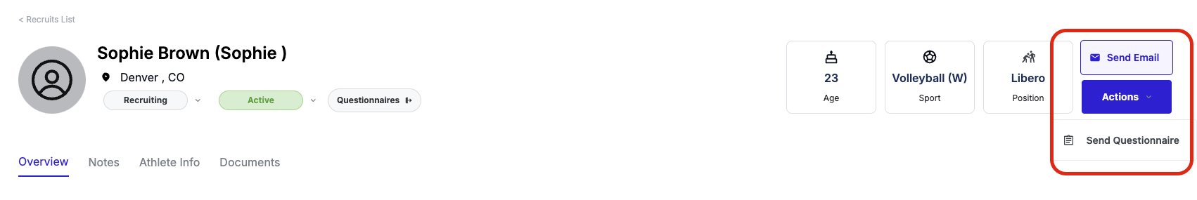 Send Emails or Questionnaires: Communicate directly from the profile by sending an email or a recruiting questionnaire, making it easy to stay engaged with your prospects.