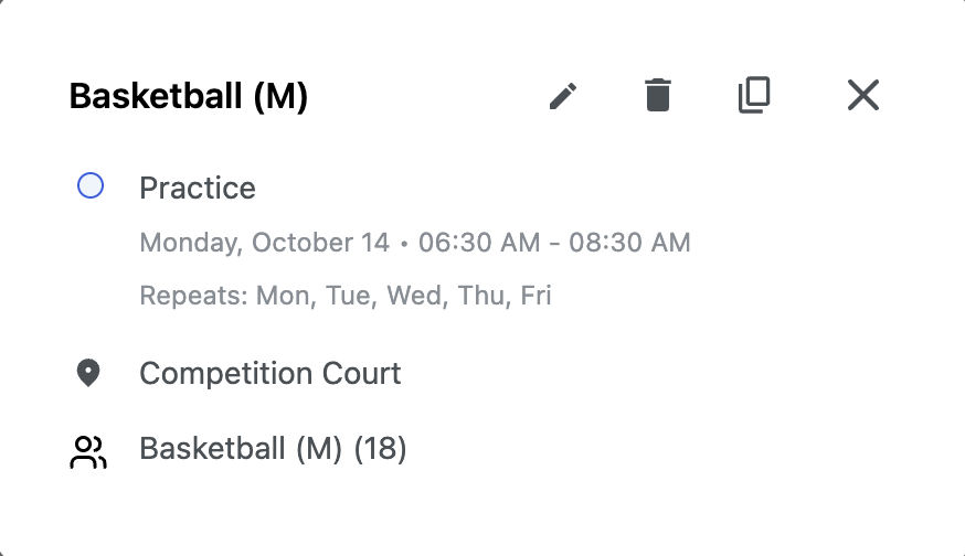 - Coaches can save views to monitor things like frequently used facilities, just practices, just competitions, etc.