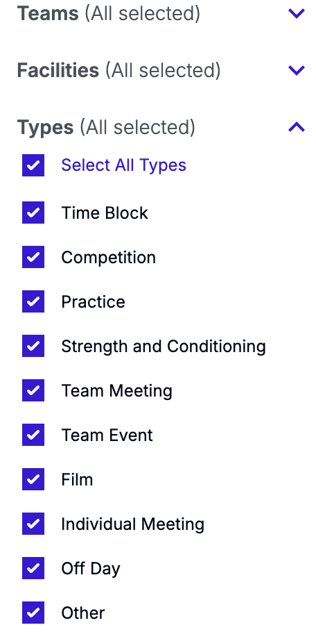 - Select specific teams, facilities, or event types to narrow down the calendar view.