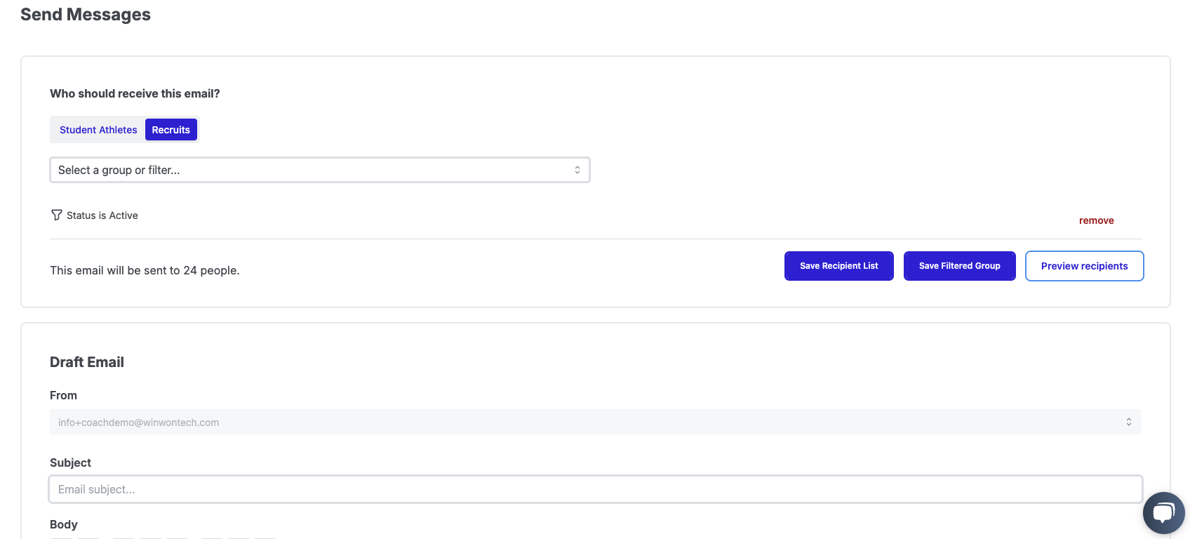 - Selecting Group will bring up another dropdown allowing you to select a group you would like to message. Click here to learn more about Creating Recruit Groups.