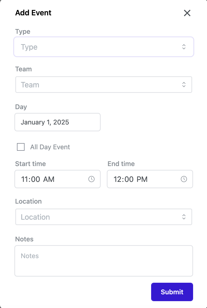 - Click Add Event in the upper-right corner or click anywhere on the calendar to open the Add Event Screen.