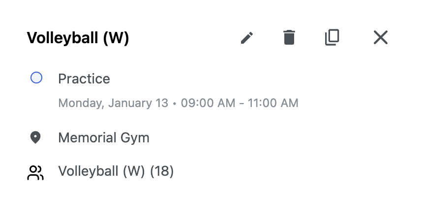 - Click the event, select the pencil icon, make changes, and click Save.