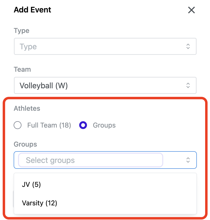 - Athletes/Participants: When you've selected the team, you will have the option to invite the full team or any groups you've created to the event. This allows you to manage participation tracking after the event. Learn more about Groups and Participation Tracking.
