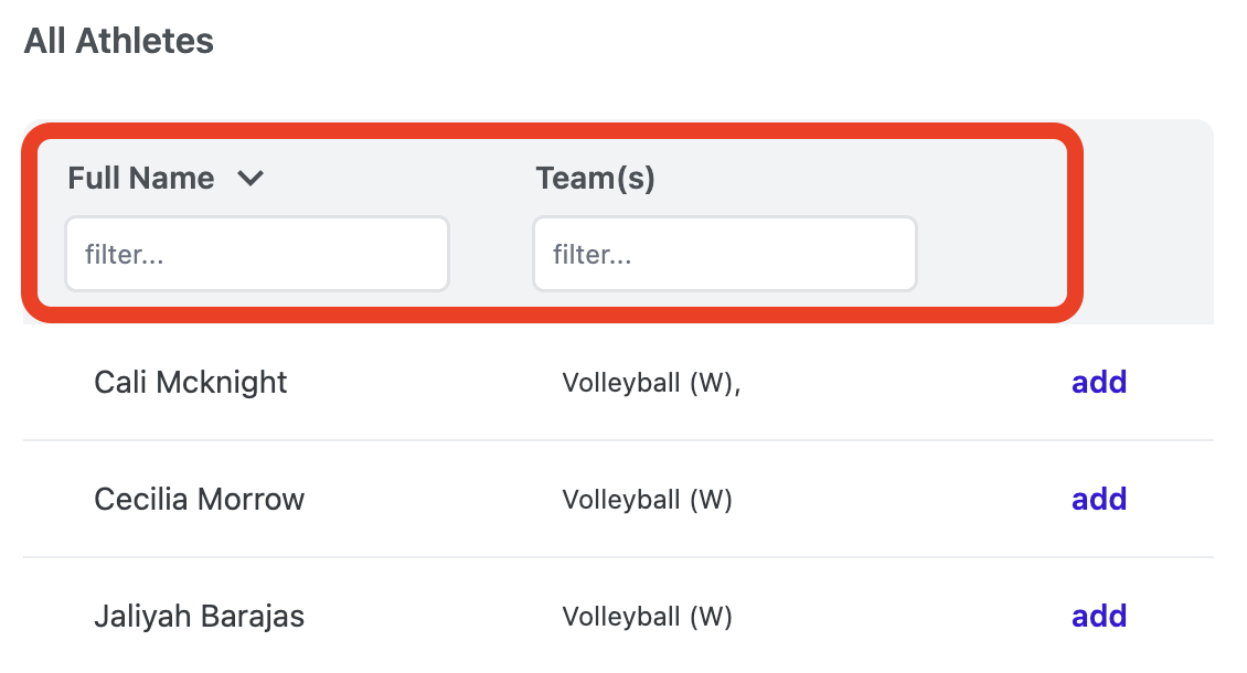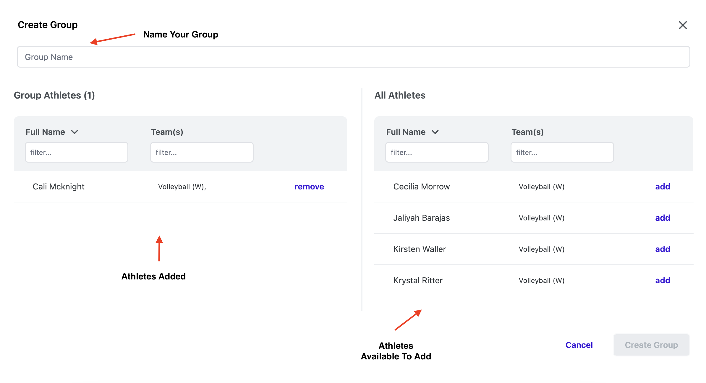 Add an athlete by selecting Add next to their name. Remove an athlete by selecting Remove. Athletes already in the group will no longer appear in the list of available athletes.