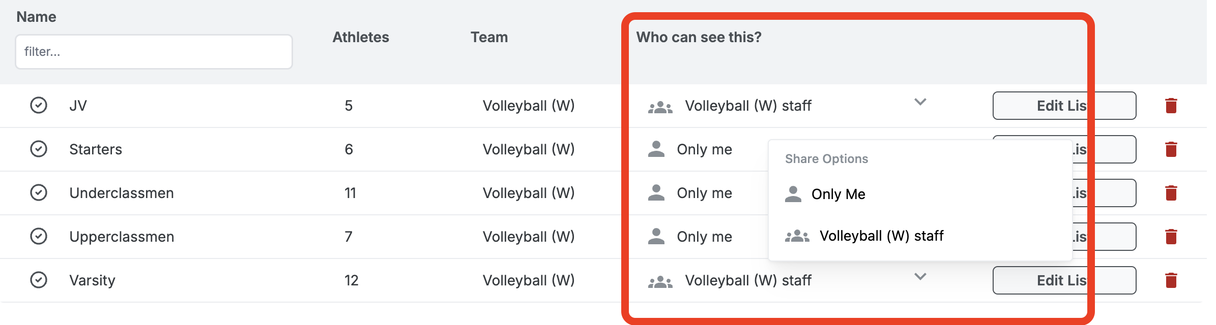 - On the Team Groups list, view details such as the group name, number of athletes in the group, the associated team, and visibility settings.