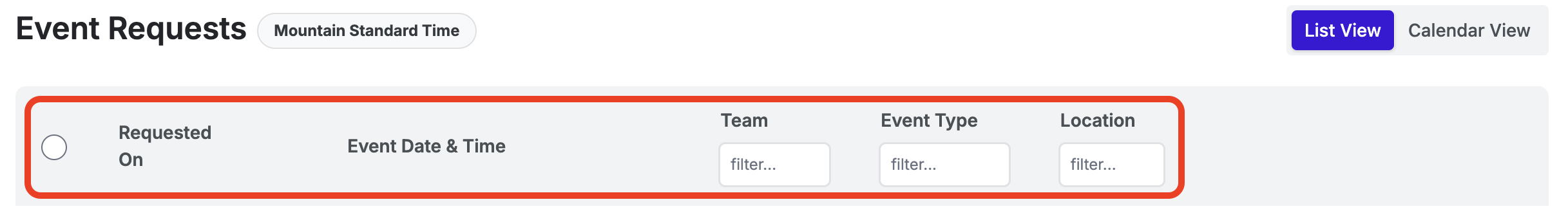 The Event Request table includes six sortable and filterable columns: