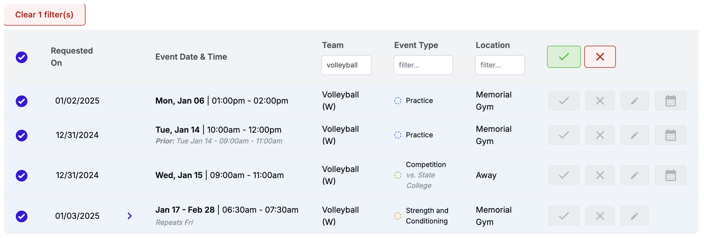 - Bulk approval is only available for the entire series of events, though individual events can be denied or edited prior to approval.