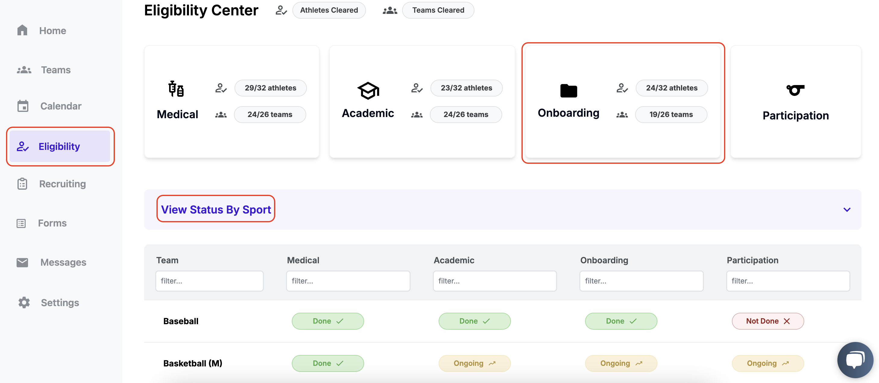 - Coach Visibility: Coaches can see a view-only version of onboarding eligibility for their athletes through their profiles. Learn more about what coaches see in the Student Athlete Profile.