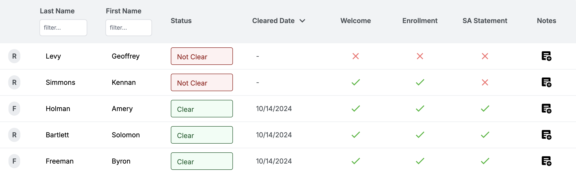 - View individual athlete notes by selecting the note icon in the Notes column.