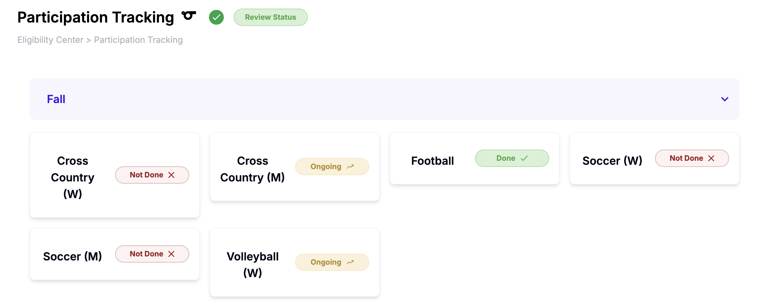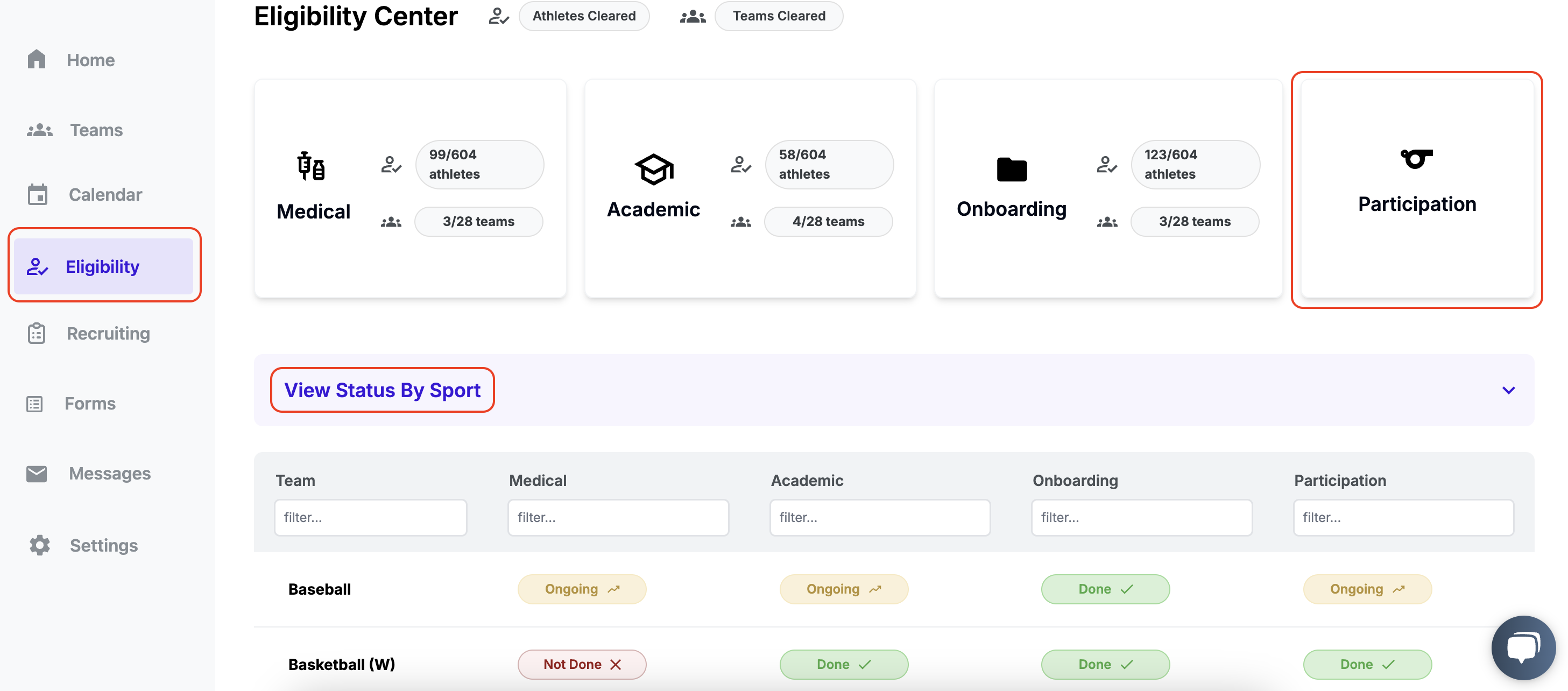 - Below, toggle View Status by Sport to see participation review statuses for each team.