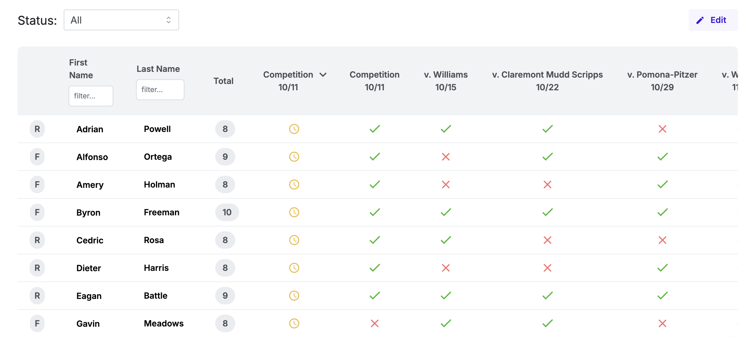 - Roster Status: Indicates if a coach has confirmed the team roster. This ensures participation is tracked only for confirmed rosters. Learn more about Confirming Rosters.