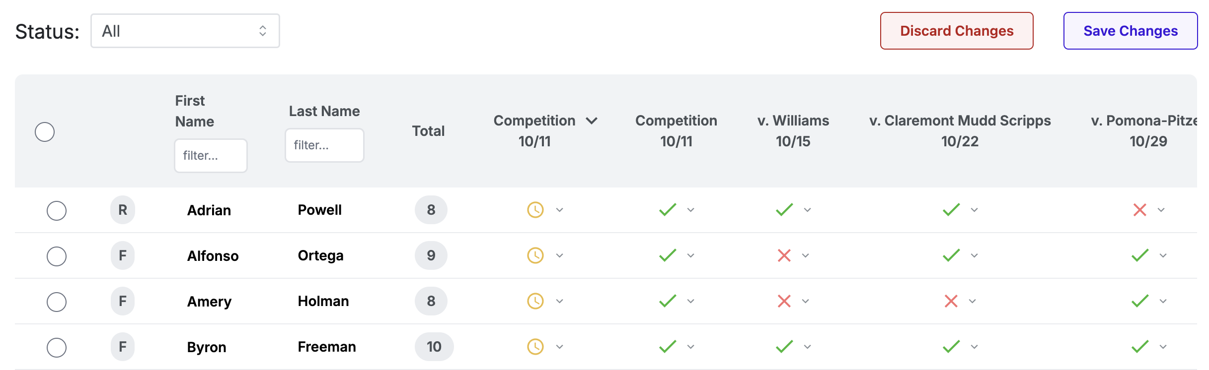 - Status bar: Filter by first-year, returning, or transfer athletes.