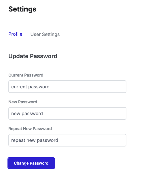 Profile Settings The Profile settings page allows users to reset their password. Resetting a Password To reset your WinWon account password: Navigate to Settings > Profile Enter your current password and what you would like your new one to be. Confirm the new password and click "Change Password" to confirm