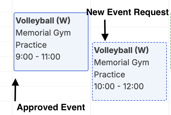 - New Request or Change Requested : Newly submitted event requests or change requests will appear with a dashed box, indicating they are pending approval.