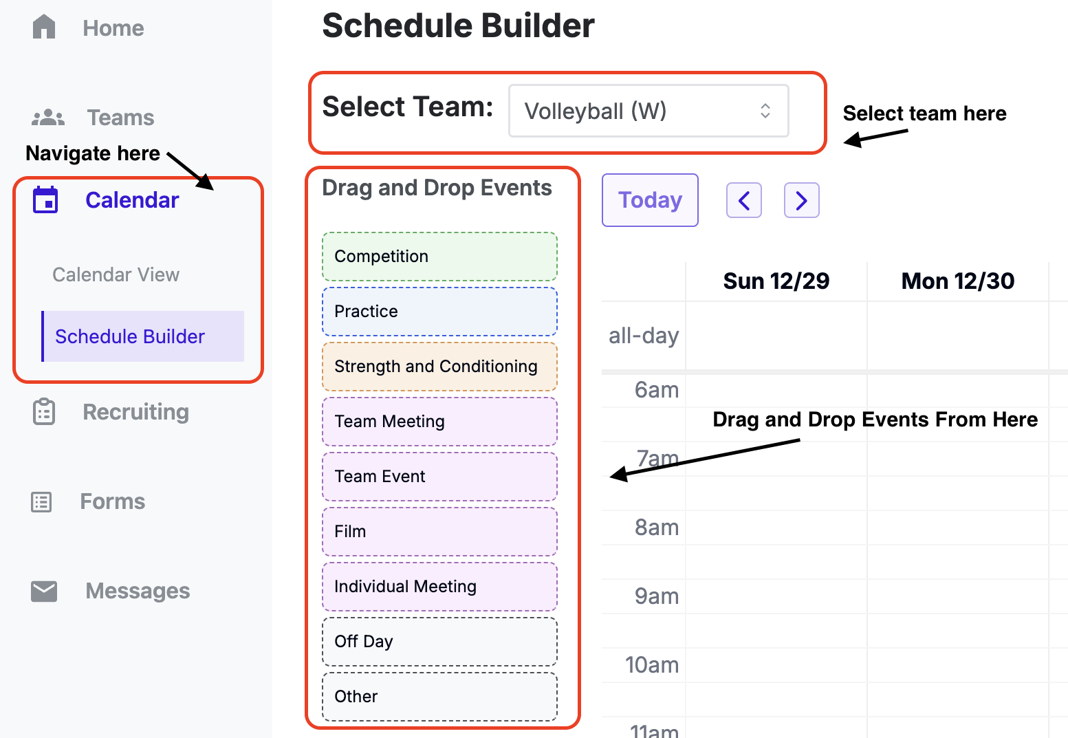 The WinWon Schedule Builder allows users to drag and drop events into the calendar for their assigned teams and submit them for approval.
