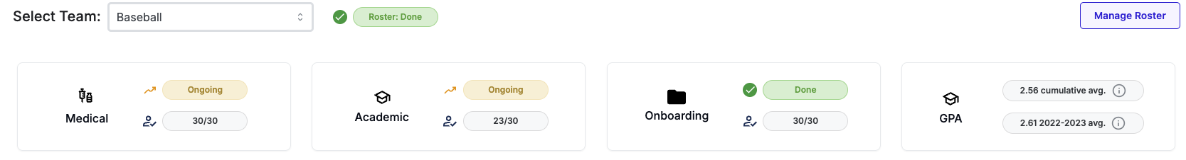 - Team Overview: At the top, see a high-level summary of your team's medical, academic, and onboarding eligibility, plus the team GPA average if it is provided by your school.