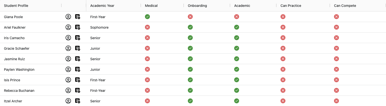 - Roster Table: Below, see a table view of your roster that provides eligibility statuses for each athlete, including whether they are cleared to practice or compete and if they have completed the different eligibility requirements. Learn more about Editing the Team Roster Table and Creating Custom Team Views